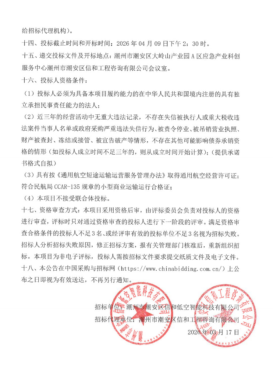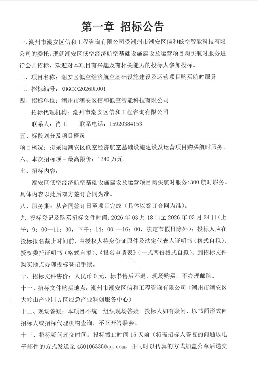 潮安区低空经济航空基础设施建设及运营项目购买航时服务-招标公告