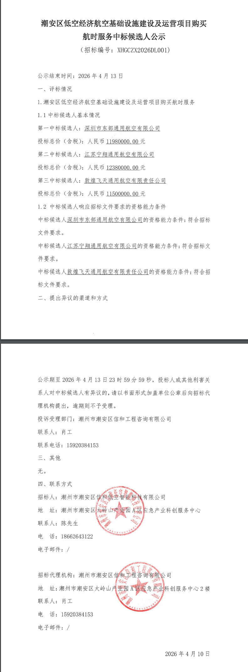 潮安区低空经济航空基础设施建设及运营项目购买航时服务-中标候选人公示