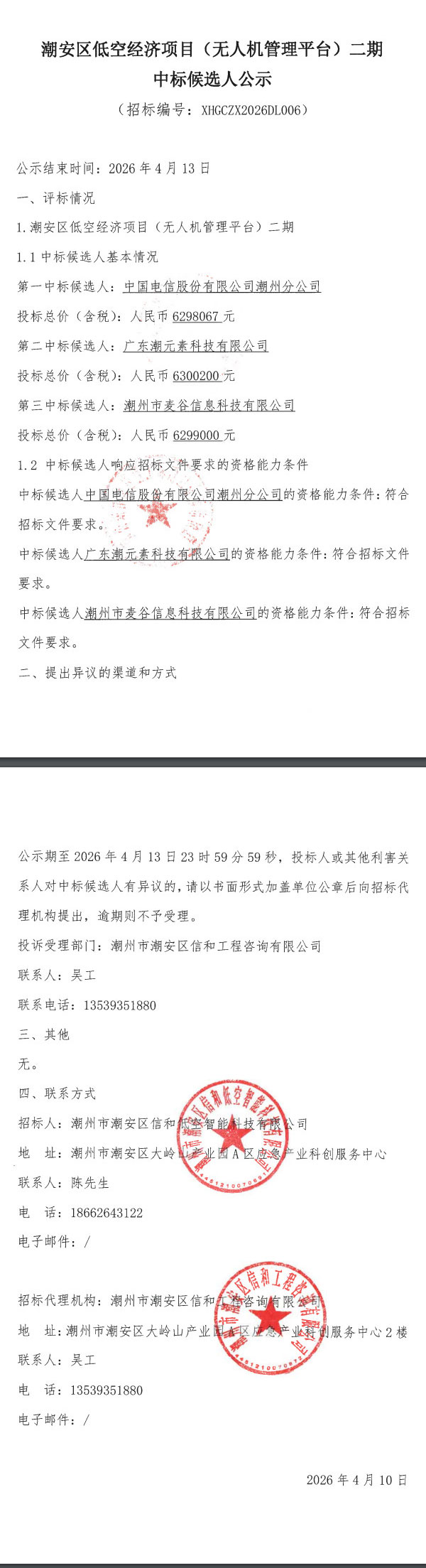 潮安区低空经济项目(无人机管理平台)二期-中标候选人公示